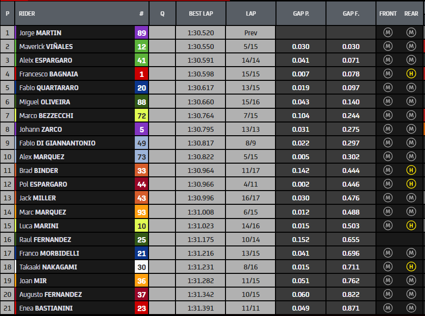 Alors commence la lutte pour la pole position, non pas entre Ducati mais avec Quartararo et Binder également en tête. Cependant, Jorge Martin s’en occupe, battant le record absolu du MotoGP (1:29.671 établi par Bezzecchi lors du GP 2022) et se plaçant fermement devant tout le monde. Mais ce n’est que le début, la bataille pour la pole s’intensifie dans les phases finales : Bezzecchi répond, mais Martin n’est pas d’accord et gagne encore plus de temps, la pole position lui appartient enfin !