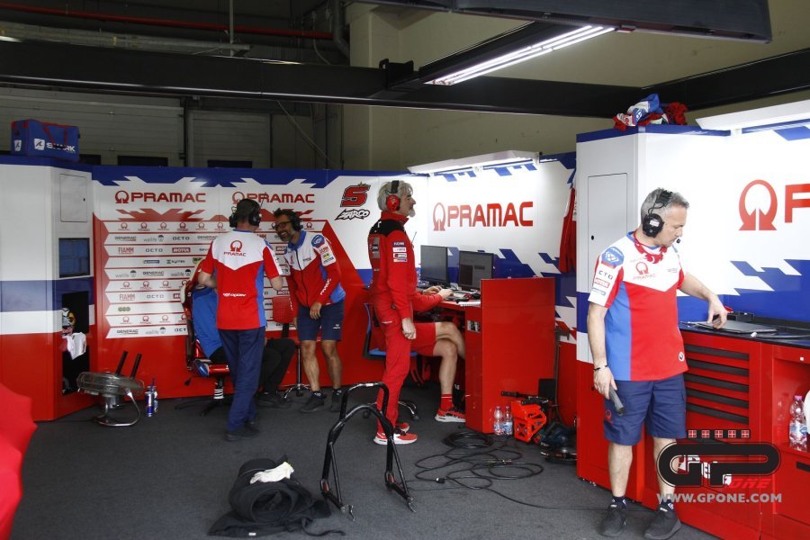 12h40 – Gigi dall’Igna est très occupé avec huit vélos sur la piste et des navettes entre une boîte et une autre. Le voici avec Luca Marini, qui parmi les Ducatisti est le plus en difficulté. Evidemment c’est une présence (presque) fixe dans la boite Pramaclato Zarcopuisque le Français est également pilote d’essai.