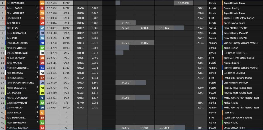 15.10 – Brad Binder s’est écrasé au virage 13. Le classement mis à jour.
