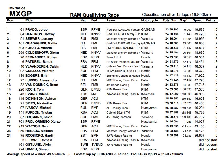 Προκριματικός Αγώνας που ανοίγει με ένα τρομακτικό πολλαπλό ατύχημα ακριβώς στην πρώτη στροφή. Μετά από έναν προσεκτικό πρώτο γύρο, η μάχη ξανάρχισε με τον Seewer στην κορυφή του Herlings (που σύντομα πήρε το προβάδισμα) και τους Prado, Forato 6ος και Lupino 10ος μπροστά από τον Guadagnini. Ωστόσο, διαρκεί πολύ λίγο, κόκκινη σημαία και όλα σταματούν για να παρασχεθεί η απαραίτητη βοήθεια ειδικά στον Φεββρ, τον οδηγό που φαίνεται να είχε το χειρότερο ατύχημα, αφού εκκενώθηκε με φορείο. Στη συνέχεια ξεκινά ξανά και είναι ο ηγέτης Prado που παίρνει το προβάδισμα, προς τέρψη του γηπεδούχου κοινού. Πίσω του βρίσκονται οι Herlings, Seewer και ένας άγριος Fernandez, ο οποίος ωστόσο περιπλέκει τον αγώνα με ένα ατύχημα. Top 3 Frozen; Ο Χέρλινγκς δεν συμφωνεί και μάλιστα κάνει έξαλλη επιστροφή για να χαλάσει το πάρτι στο κατοικίδιο του σπιτιού. Αλλά αυτό δεν είναι αρκετό, ο Prado έχει ακόμα αρκετά περιθώρια για να θριαμβεύσει μπροστά από την αντίπαλό του KTM. Τι κρίμα για τη Renaux, KO λόγω τεχνικού προβλήματος με τη Yamaha του!
