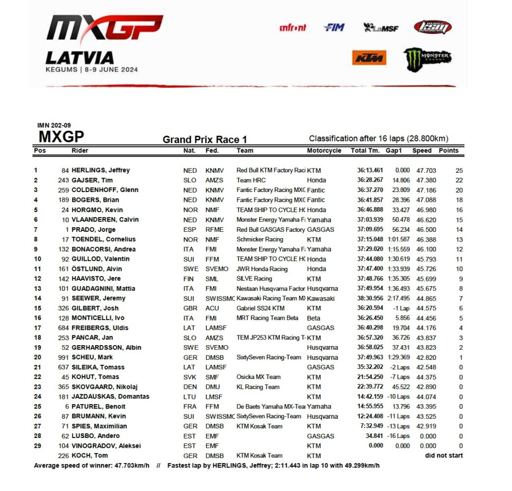 Jorge Prado byl na startu nejrychlejší, ale holeshot tentokrát nebyl tak rozhodující jako při jiných příležitostech. Herlings a Gajser, kteří v sobotu zvítězili v kvalifikačním závodě MXGP, vyvinuli silný tlak, až Prado udělal chybu a vklouzl do břicha skupiny. Zoufalý comeback ho vrátil do pozice, která alespoň omezuje škody. Tim Gajser nedokázal udržet svého nizozemského soupeře, ale nyní vede průběžné pořadí mistrovství světa, které mění majitele prakticky každý závod. Odchovanec Hondy HRC má náskok sedmi bodů, zatímco Herling je třetí -66 bodů od vrcholu. Druhé kolo Kegumů bude totální bitva. Mezitím zaznamenáváme deváté místo Andrea Bonacorsiho (Yamaha), zatímco Mattia Guadagnini (Husqvarna) skončil třináctý.