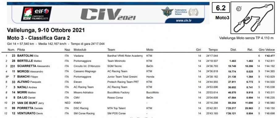 Au terme d’une très longue saison au cours de laquelle les protagonistes incontestés se sont révélés, le verdict de la CIV Moto3 s’est prononcé en faveur d’Elia Bartolini au détriment de Mattia Bertelle. Dans une Course 2 électrisante (caractérisée au départ par les chutes distinctes de Zonta Van Den Goorbergh, Biagio Miceli et Michele Amadori), le talentueux couple de coureurs italiens a facilement fait un vide vers le reste du groupe, donnant vie à un dualisme épuisant sans exclusion de coups. En parlant de coups, le moment décisif est venu ensuite dans les derniers tours, lorsque Bartolini a tenté un nouveau dépassement sur son rival dans la Curva Grande: une manœuvre peut-être trop optimiste qui l’a conduit à heurter accidentellement la KTM de Bertelle, qui a progressivement perdu le contact grâce à l’explosion de l’airbag due au coup reçu. Le porte-drapeau de la Bardahl VR46 Riders Academy a ainsi pu conquérir le titre ainsi que son doublé personnel à l’usine de Campagnano, tandis que le porte-drapeau du Team Minimoto a dû se contenter de la deuxième place, d’ailleurs dans les deux contextes, pour seulement sept points. Plus de 19 secondes derrière le duo de tête, Alessandro Sciarretta (SGM Tecnic) a décroché le premier podium de sa carrière au sprint pour seulement 0”025 sur les wild card d’exception comme Alessandro Morosi. En cinquième position Filippo Bianchi (pénalisé d’une seconde pour limite de piste), Pasquale Alfano, Andrea Natali, Matteo Morri, Daniel Da Lio (bon pour récupérer du fond de la grille) et Jerry Van De Bunt.
