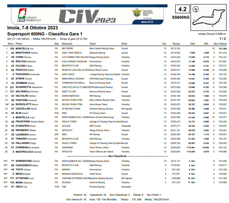 Yari Montella et Andrea Mantovani ont clairement dominé la première course à Imola. La première wild card avec Barni Racing, son équipe mondiale, la deuxième encore avec Mesaroli Racing by VMR après le remplacement réussi lors de la manche à Misano. Pole position pour Mantovani devant Montella, ce dernier ayant un départ loin d’être parfait, mais peu après le départ, il a réussi à trouver l’occasion gagnante de prendre la tête. Cependant, le Ferrarais est toujours resté très proche, jusqu’à ce qu’il ferme le volant dans la variante basse ce qui augmente l’écart entre les deux à une seconde, en pleine fuite et donc premier et deuxième à l’arrivée. Plus loin, Simone Corsi, septième sur la grille, parvenait à remonter régulièrement pour finalement monter sur la troisième marche du podium et sceller son titre italien.