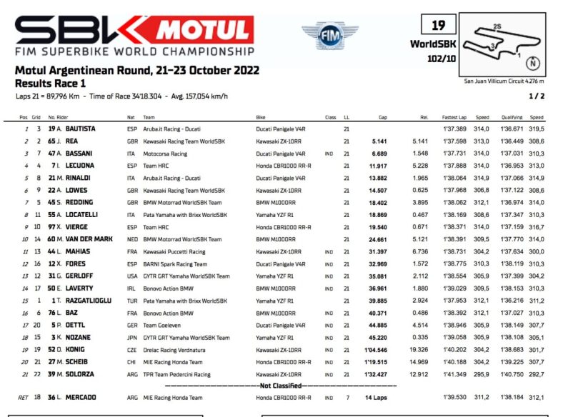 Depuis quelque temps, Bassani n’est plus un météore, pas même le secteur privé qui se dévoile parfois. Avec la Ducati du team Motocorsa il est désormais toujours là, toujours plus proche des grands noms. “Je voulais être avec Bautista mais aujourd’hui c’était impossible”, a-t-il déclaré dans un parc fermé. De belles paroles : le Veneto de 22 ans vise de plus en plus haut. Jonathan Rea, du haut de ses six championnats du monde, a dû transpirer sept maillots pour prendre le dessus sur cet incroyable Bassani. “Il a été très fort à certains moments de la piste”, a reconnu le Nord-Irlandais qui a finalement, avec des bons et des moins bons chronos, réussi à prendre le dessus sur lui. Rea a félicité le vainqueur, reconnaissant qu’il avait un avantage ici.