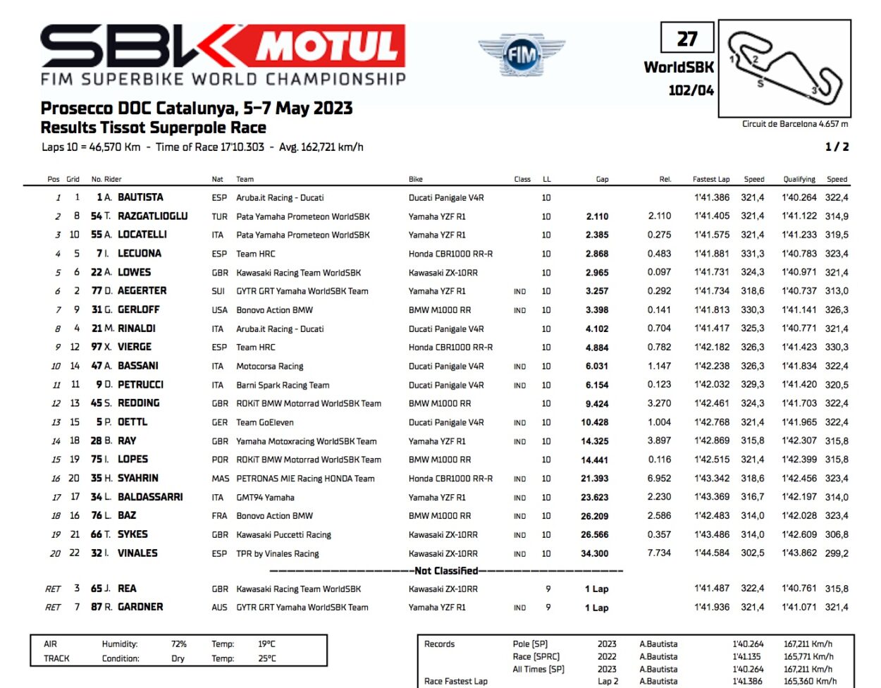 Er werd gezegd dat Alvaro Bautista allergisch was voor water, maar hij liet in ieder geval op dit circuit zien dat hij zelfs in moeilijke omstandigheden, d.w.z. slicks op asfalt dat verraderlijk is geworden, slaagt als een meester. Toen hij begon te druipen, had de Ducatista ongeveer 2 seconden over, dus hij had alles te verliezen. Nog drie ronden te gaan, maar Toprak en Rea liepen achter, meestal formidabel in wisselende omstandigheden. In plaats daarvan heeft hij zijn zelfbeheersing niet verloren, noch heeft hij zijn voorsprong verloren. Terwijl ze achter elkaar vochten, pakte Alvaro zijn tiende succes van het jaar, in elf races. In een poging om Toprak te weerstaan, ging Jonathan in plaats daarvan in bocht 1 liggen: kans weggegooid. In de slotchaos leek de excellente Andrea Locatelli de 1-2 Yamaha op het podium te completeren, zij het op de minder nobele treden.