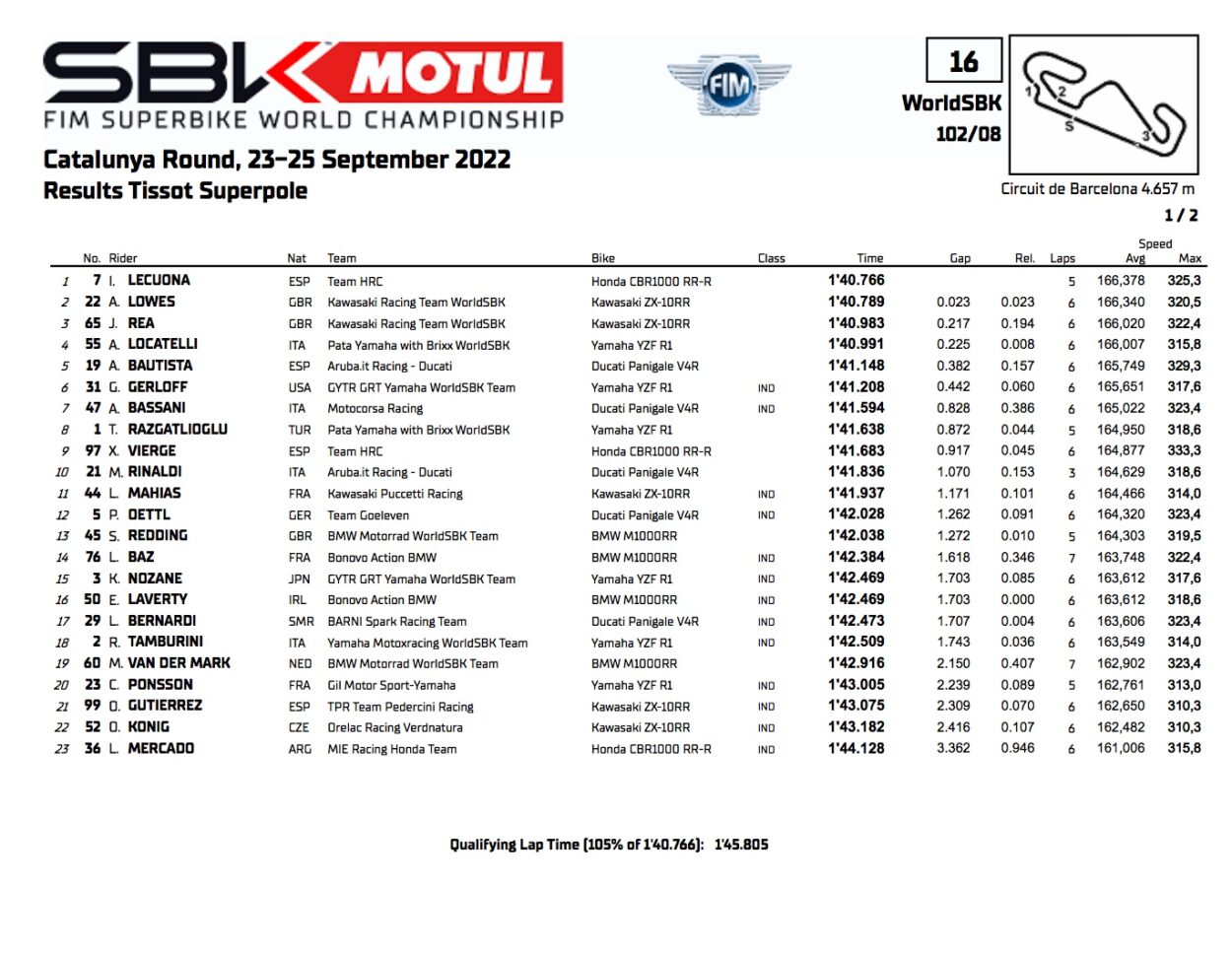 Risiko hujan melepaskan kelompok liar Superbike di kualifikasi paling menarik tahun ini. Setelah sesi pencicipan pertama, dengan tetesan air yang turun di beberapa tikungan, semuanya diputuskan dalam tugas terakhir, dengan karet SCQ yang sangat lembut. Mengambil keuntungan dari kereta Kawasaki, Iker Lecuona yang spektakuler berhasil melontarkan Honda CBR-RR ke pole: itu adalah deru pertama dari mantan MotoGP, yang telah menjadi yang tercepat pada Jumat pagi (lagi dengan ban SCQ). Kedua Kawasaki akan start dari barisan depan dengan Alex Lowes di depan Jonathan Rea. Petenis Irlandia Utara itu menyerang balik Alvaro Bautista tercepat kelima (baris kedua) dan Topra Razgatlioglu kedelapan (baris ketiga).