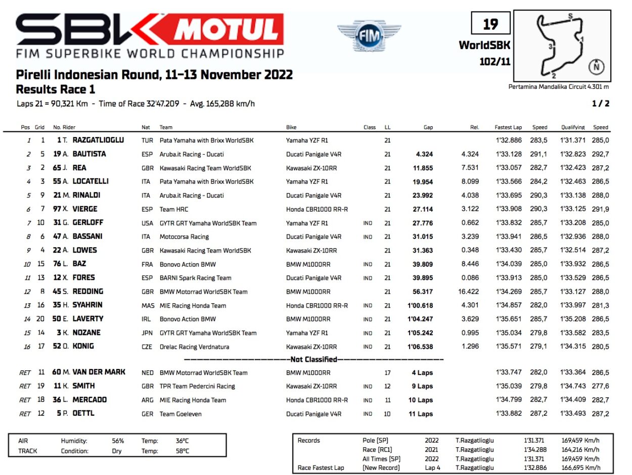 Honda war mutig in das indonesische Wochenende gestartet, aber Iker Lecuona wurde durch einen Sturz im zweiten Training am Freitag verletzt. Der Spanier erlitt einen Bruch des zwölften Lendenwirbels ohne neurologische Beteiligung. Er wurde schnell aus dem Krankenhaus entlassen, aber offensichtlich endete seine Weltmeisterschaft vorzeitig. Auch Lucas Mahias kam nicht in Frage, die Ärzte verweigerten ihm die Startberechtigung für Rennen 1 wegen einer Knöchelverstauchung, die beim Sturz im FP3 behoben wurde. Kawasaki-Fahrer Puccetti wird versuchen, die beiden Rennen am Sonntag zu fahren.