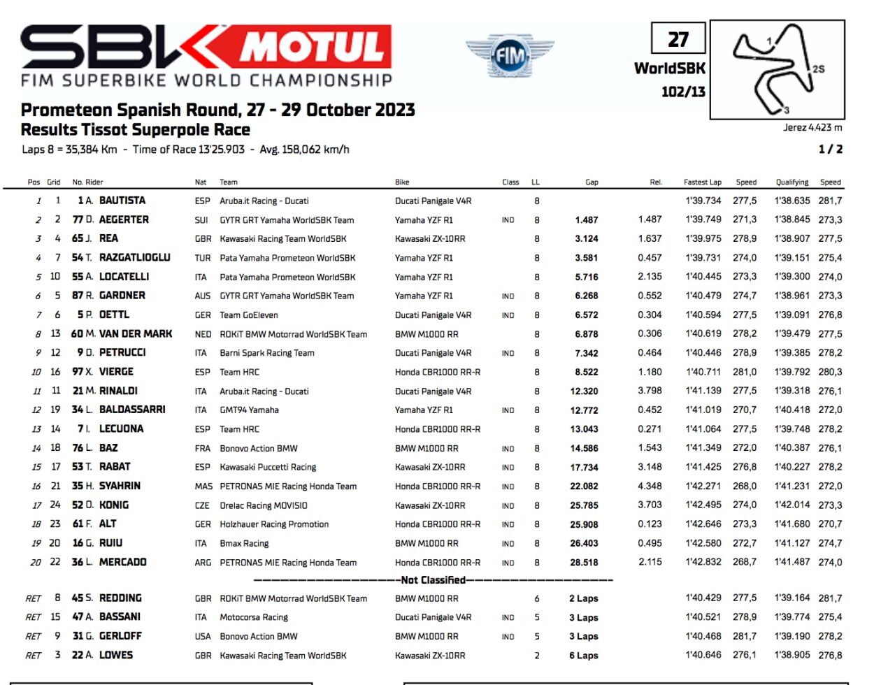 Álvaro Bautista a déjà célébré son deuxième titre en Superbike mais la fête à Jerez ne l’a pas rassasié de faim. Le pilote Ducati a également été acharné lors de la Superpole Race, remportant le triomphe numéro 26 au cours de cette année exceptionnelle, la 58e de sa carrière. S’il récidive cet après-midi, il rejoindra Carl Fogarty, l’une des légendes des dérivés de la série. Bautista a également dominé sur la distance du sprint, gérant parfaitement le Pirelli SCQ, le pneu de qualification super tendre, qui a plutôt plongé Toprak Razgatlioglu dans la crise, seulement quatrième. La gestion de l’adhérence aurait-elle pu être une question de légèreté ou de sensibilité de conduite de l’Espagnol ?