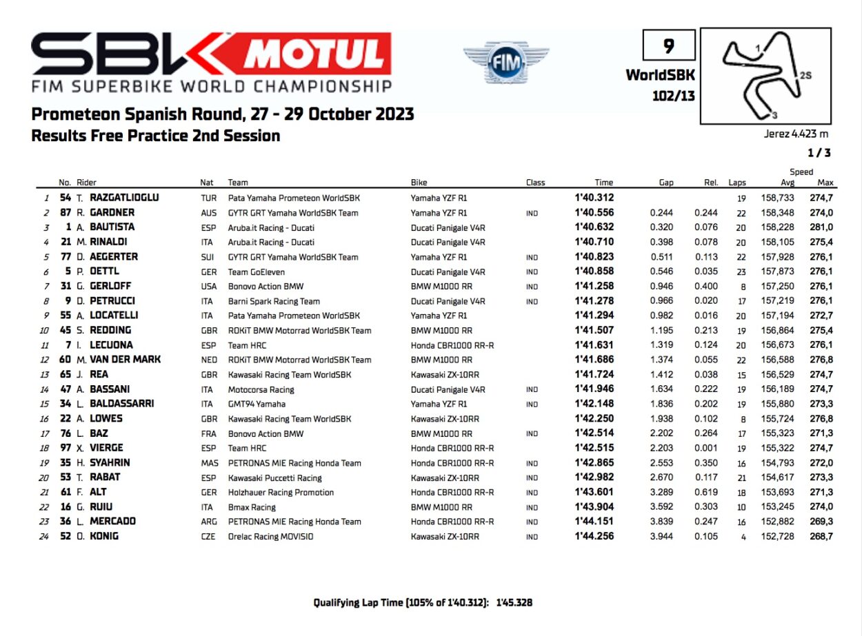 Alvaro Bautista a hâte de mettre la main sur le deuxième Championnat du Monde Superbike consécutif, il ne lui manque que deux points sur 62 points disponibles. Le week-end de Jerez sera donc une fête, qui a pourtant débuté par une chute au virage 6. Rien de grave, le (presque) double champion du monde a été trahi par une imperceptible tache d’humidité, avec une fermeture brutale de la partie avant. Il n’est pas non plus nécessaire de se débarrasser de la poussière, car Alvarito n’est même pas arrivé dans le sable. A l’issue des jeux, le plus rapide vendredi a été Toprak Razgatlioglu, dans le dernier tour des joutes avec Yamaha : 1’40″312. Bautista s’est arrêté à 320 millièmes, dépassé à la dernière minute par l’autre R1 d’un Rémy Gardner qui était clairement en pleine ascension en fin de saison. Quatrième place provisoire pour Michael Rinaldi, huitième temps pour Danilo Petrucci.