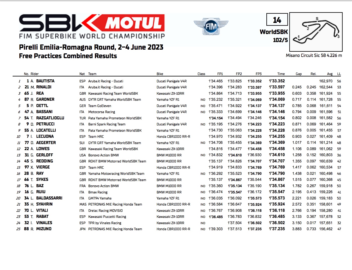 In de derde en laatste Superbike vrije training in Misano monteerde Alvaro Bautista de nieuwe superzachte SCQ-band, waarmee hij de tien ronden van de sprintrace simuleerde. De respons van de chronometer was verbluffend: 1’33″352, slechts een adem verwijderd van het Superpole-record van een jaar geleden, heel dicht bij de schokkende referentie van 1’33″35 die de Spanjaard zelf drie weken geleden in de tests had gedrukt. Behoudens verrassingen en onvoorspelbaar weer, zal het grote publiek dat in de rij staat aan de kassa genieten van weer een dwingend trio van de coureur van het moment.