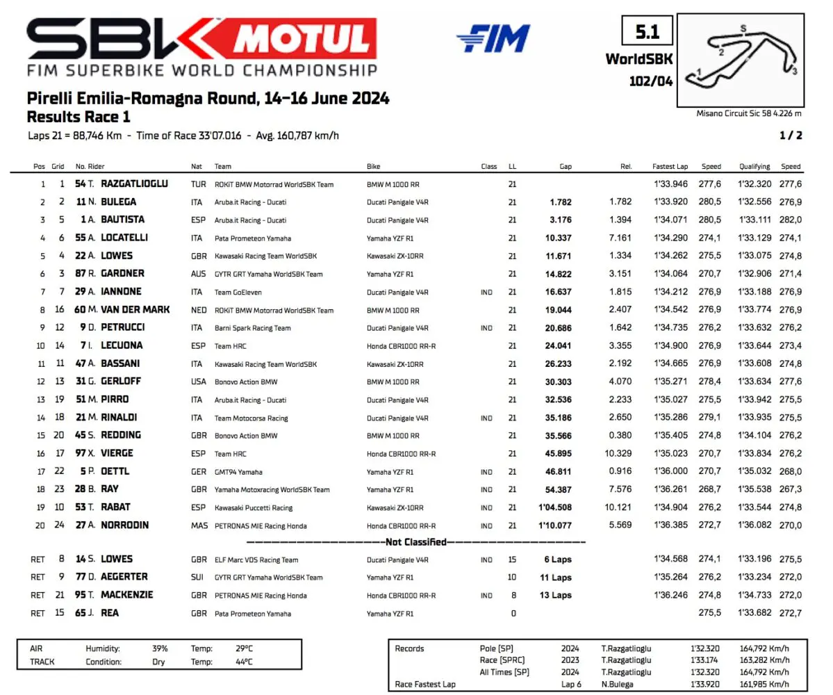 Het langverwachte rustieke duel tussen Toprak en de Ducatisti kwam niet uit. Bij de start raakte Remy Gardner betrokken bij de Yamaha en leidde het peloton anderhalve ronde. De snelste om van hem af te komen was de BMW-topman, terwijl Bautista en Bulega kostbaar terrein verloren, zelfs onderling. Nicolò, tussen de twee, wekte de indruk schonere lijnen en een grotere marge te hebben, maar die twee of drie ronden achter zijn teamgenoot zorgden ervoor dat hij zijn ritme verloor, ook door een lichte slip bij het naderen van de Chariot. Toen Bulega in de Rio-bocht zijn teamgenoot wist in te halen, had de voortvluchtige al een marge van twee seconden. Het zijn min of meer dezelfde die het verschil maakten aan de finish.
