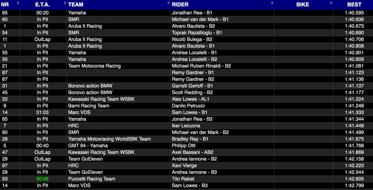 Andrea Iannone, disions-nous, navigue actuellement aux alentours de la vingtième position : pour lui 1’42″158, mais pour évaluer son niveau il faudra attendre (au moins) la conclusion de ces deux jours d’essais Superbike. En Espagne, il y a quelques jours, il était très rapide, il est donc prévisible qu’il trouvera sa voie ici aussi. Pour le moment, Andrea Locatelli se porte très bien, avec sa jumelle officielle Yamaha, ainsi que Michael Rinaldi, qui n’a roulé qu’une journée à Jerez, histoire de se débarrasser de la rouille hivernale. Conclusion à 18h00, heure italienne.