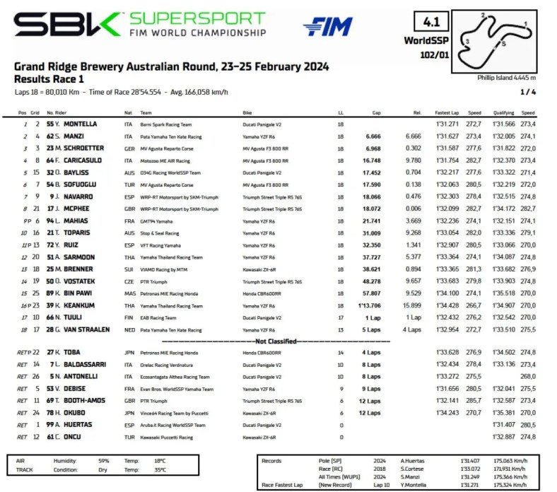 Le plus sensationnel déjà lors du tour de déploiement, quand Adrian Huertas, qui a pris la pole, s’est plaint de problèmes avec sa Ducati. L’Espagnol, après avoir quitté la grille, a quitté le garage, pour vérifier que le problème persistait. Les débuts avec l’équipe d’Aruba, en tant qu’héritière du champion en titre, sont reportés à demain. Mais il devra s’élancer de la quatrième ligne, en vertu du nouveau mode de composition de la grille de départ de la course 2 qui récompense les auteurs des neuf tours les plus rapides dans les trois premières lignes. Dimanche, Montella partira de la pole avec Schotter et Manzi lui tenant compagnie au premier rang. Dans cette même course 1, la MV Agusta de Bahattin Sofuoglu a été reléguée en fond de grille en raison d’une pression irrégulière des pneus. Le pilote turc remontait alors en sixième position.