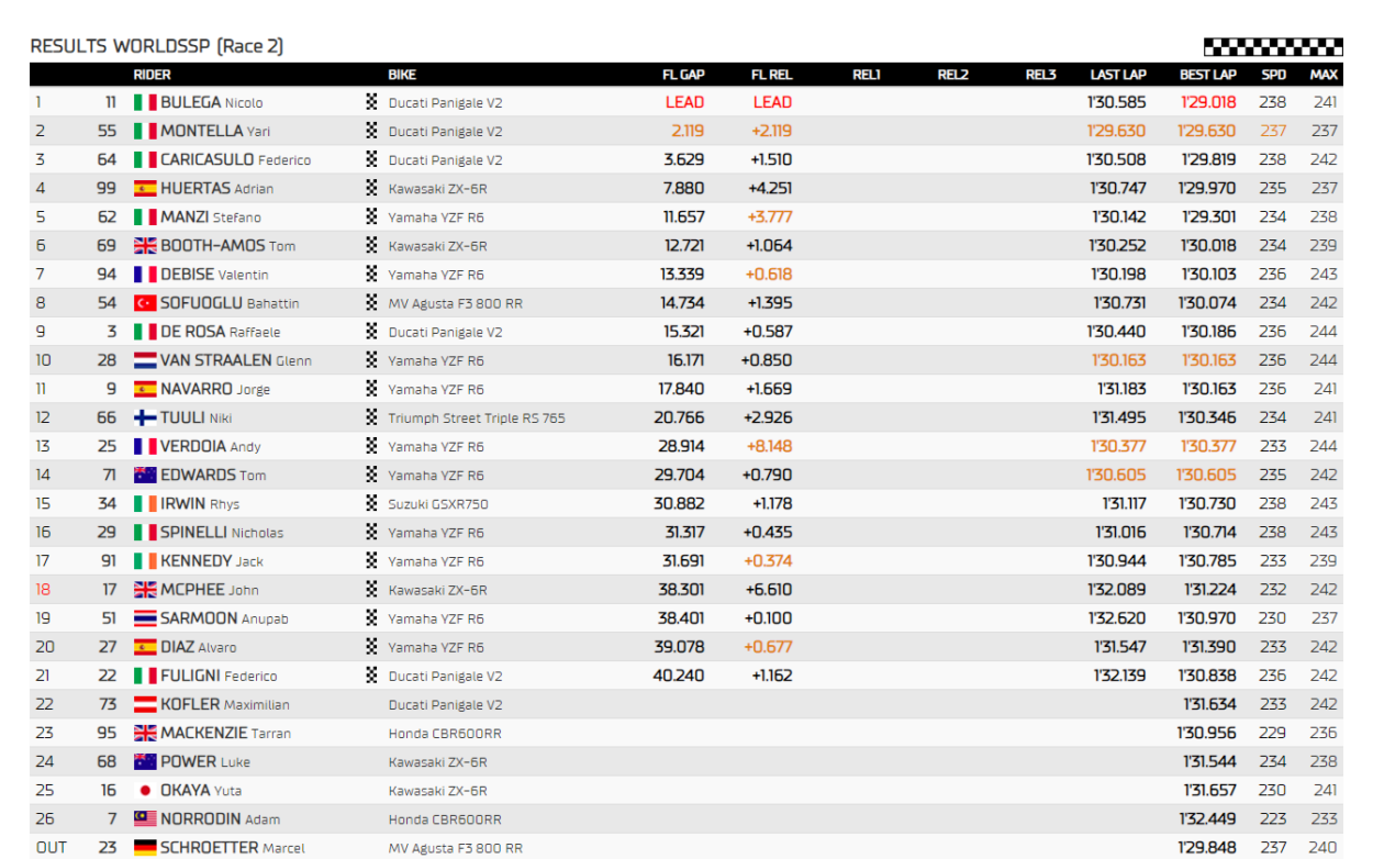 Stefano Manzi eindigt de race op de vijfde plaats: met een crash en een lange ronde is het nog steeds een hele prestatie om binnen 11″6 van Bulega te komen. In de top 10 ook Raffaele De Rosa. Weer een geweldige prestatie van de Engelsman Tom Booth-Amos, zesde en eerste in de Challenge met Fabio Uccelli’s MotoZoo Kawasaki, in alle opzichten het revelatieteam van dit kampioenschap. In de punten de Ierse wildcard Rhys Irwin met de Suzuki GSXR750. Een Suzuki zie je al jaren in de Supersport en om hem zelfs in de punten te zien is erg mooi.
