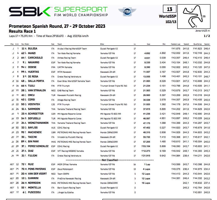 Supersport continue de parler italien, car Stefano Manzi et Federico Caricasulo ont croisé le fer derrière Bulega, se battant longtemps pour la deuxième place. Le pilote romagnol de Yamaha Ten Kate s’est imposé. En parcourant le classement, on retrouve Raffaele De Rosa en septième position devant Lorenzo Dalla Porta. L’apprentissage de l’ancien champion Moto3 se poursuit avec des hauts et des bas. Le véritable défi pour lui, prochainement, sera de trouver un forfait valable pour la prochaine aventure.