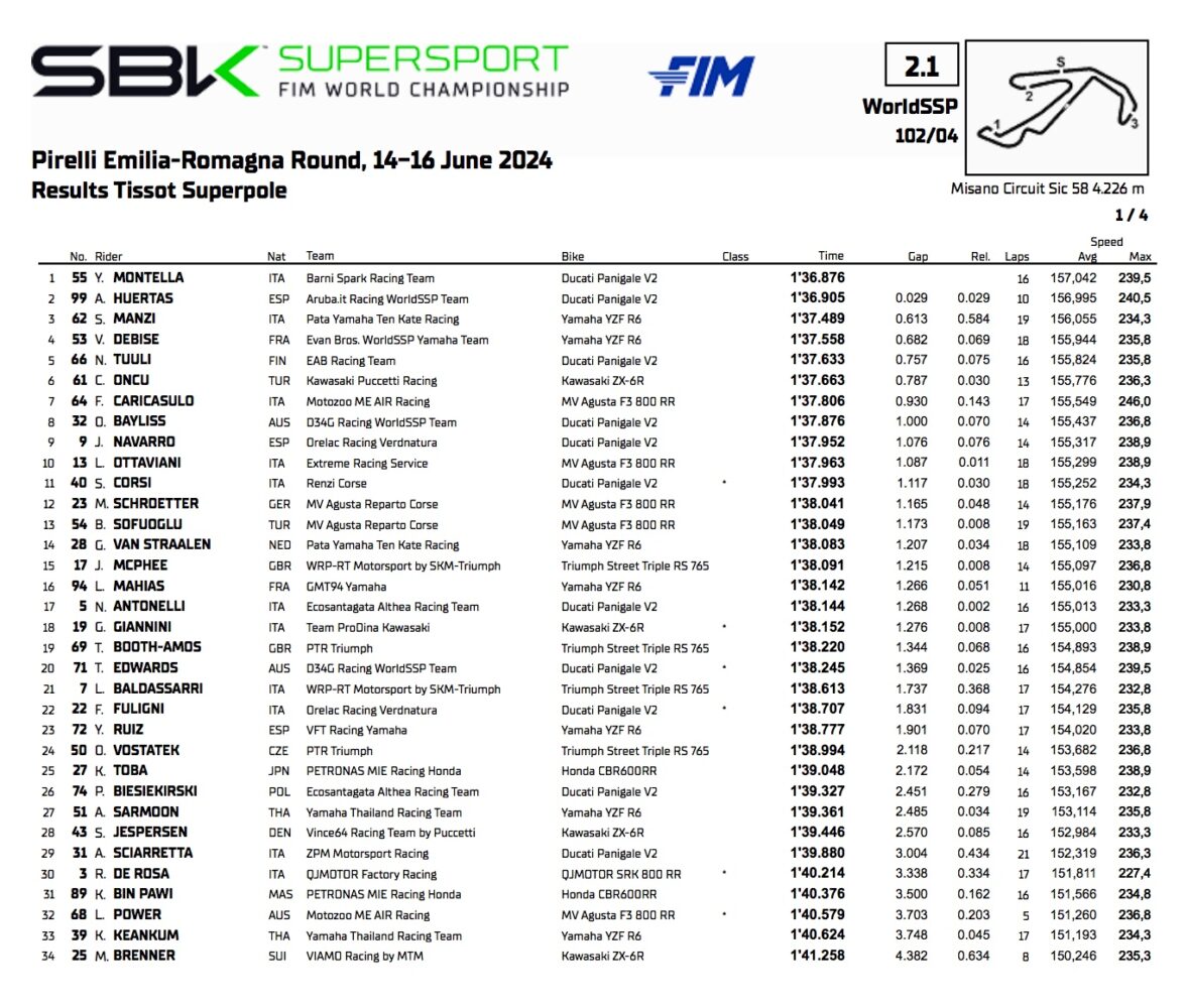 Supersport-viikonlopun alku ei ollut loistava Federico Caricasulolle, joka kuitenkin onnistui pelien lopussa katapultoida Motozoo-joukkueen MV Agustan seitsemännelle sijalle, joka on kolmannen rivin arvoinen. Toiseksi lähtevät huonot asiakkaat kuten Valentin Debise, Niki Tuuli ja ennen kaikkea Can Oncu. Jälleen uuden leikkauksen (osastosyndrooma) jälkeen turkkilainen on palaamassa muotoonsa ja lupaa kipinöitä vintage Kawasakilla, mutta uusimman teknisen kehityksen ansiosta. Puccetti-tiimi juhlii tässä tilaisuudessa 30-vuotista toimintaa, viisinkertaisen maailmanmestarin Kenan Sofuoglun suojelija odottaa olevansa iso yllätys kahdesta monista tuntemattomista alkavista kisoista. Huomionarvoinen on CIV:n päähenkilön Luca Ottavianin kymmenes paikka täällä villinä korttina. Jos ne ovat ruusuja…