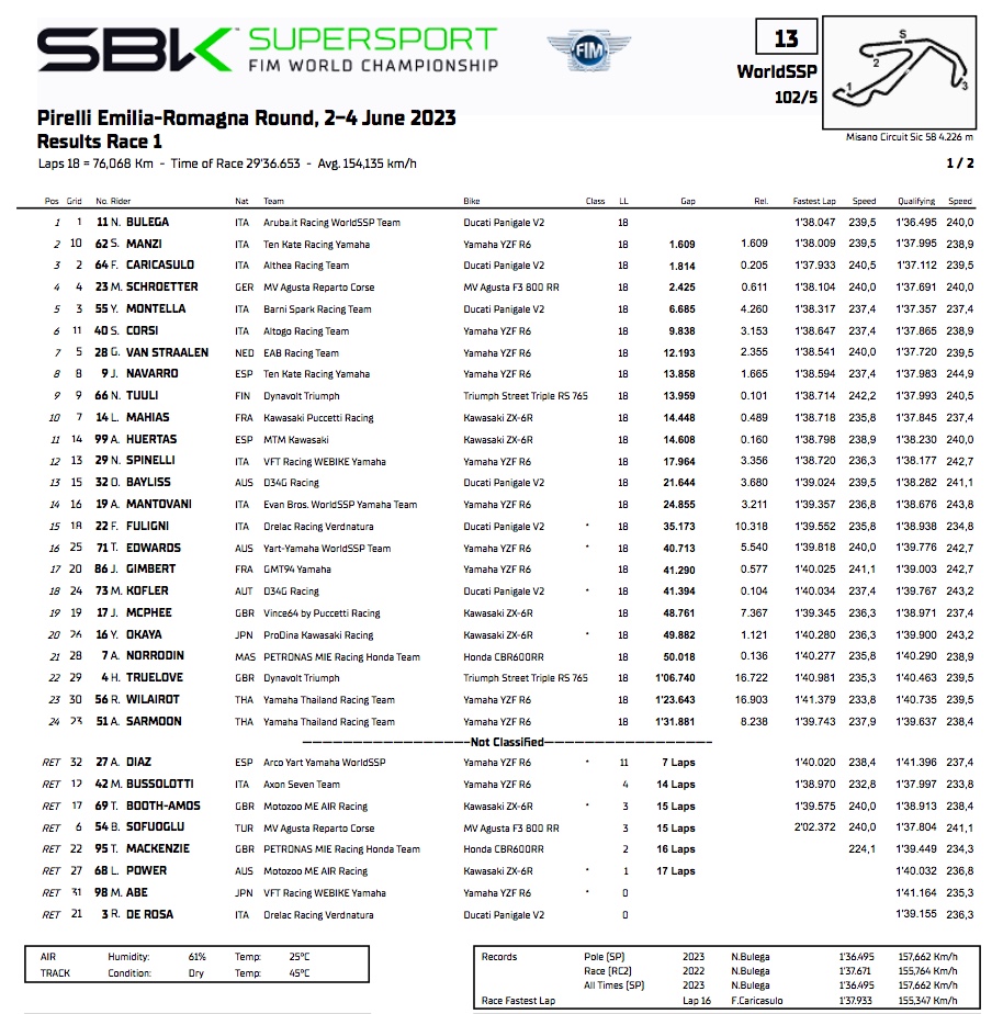 Penampilan anonim lainnya untuk Andrea Mantovani, keempat belas di garis finis. Penampilannya di Kejuaraan Dunia Supersport dengan salah satu Kejuaraan Dunia Supersport yang berpotensi lebih kompetitif tidak dapat dijelaskan.