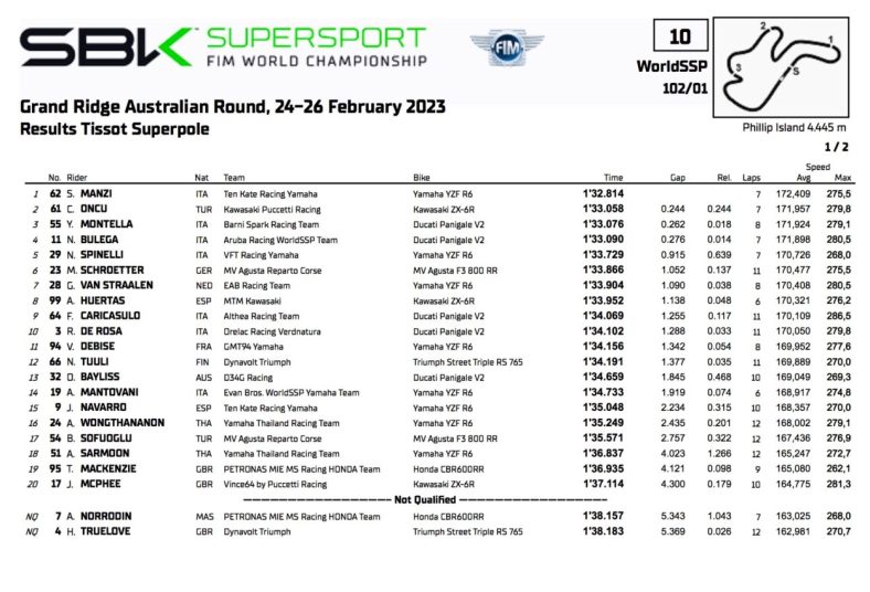 Stefano Manzi kon zijn debuut met de Yamaha Ten Kate niet beter dopen. De rijder uit Romagna pakte zijn eerste pole in het Supersport Wereldkampioenschap op Phillip Island, een perfecte interpretatie van een kwalificatie die werd veroorzaakt door een korte regenbui vlak voor de start. Vrijwel de baan was alleen (bijna) droog in de laatste vijf minuten, toen Manzi uit zijn dak ging en iedereen in de rij zette. Het is een enigszins verrassend resultaat, gezien het feit dat Niccolò Bulega met de Ducati alle voorgaande sessies had gedomineerd. De voormalige Moto2-coureur kwam in de laatste wervelwind op de vierde plaats terecht en zal dus vanaf de tweede startrij moeten starten. Tegenover deze Manzi zal het niet makkelijk zijn om te mikken op het eerste wereldsucces van de Ducati Panigale V2.