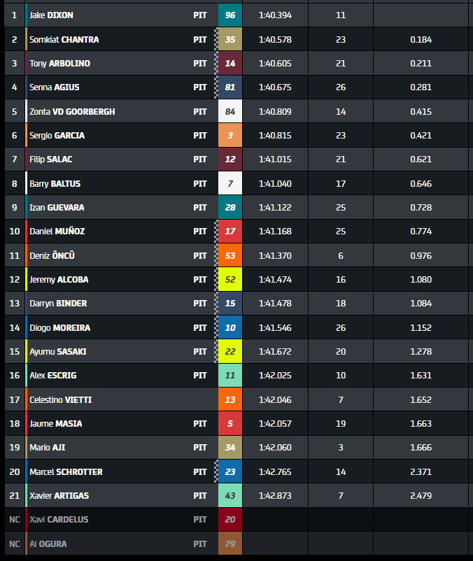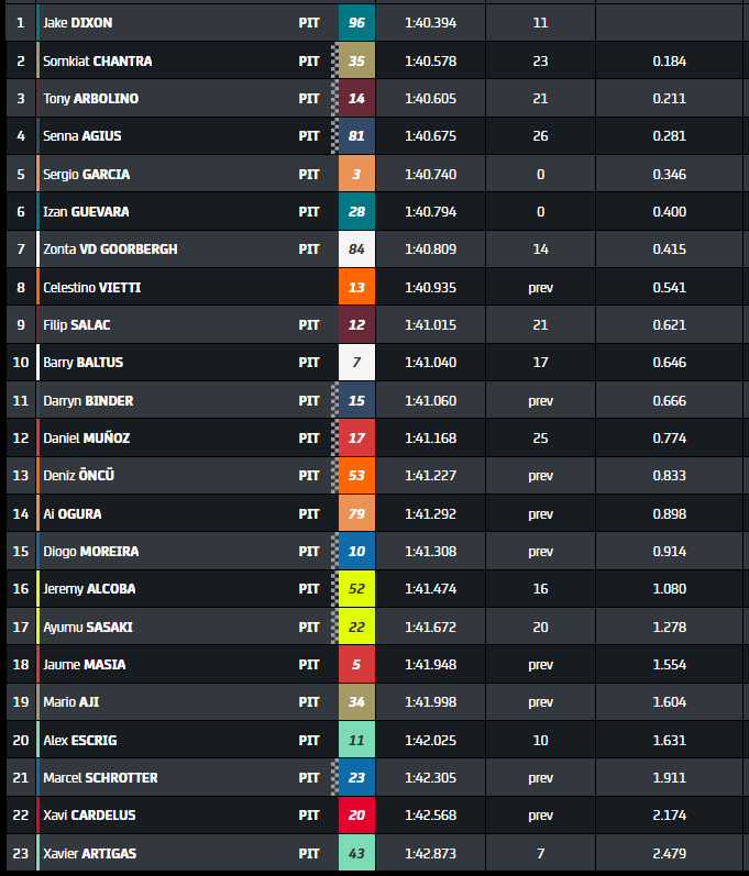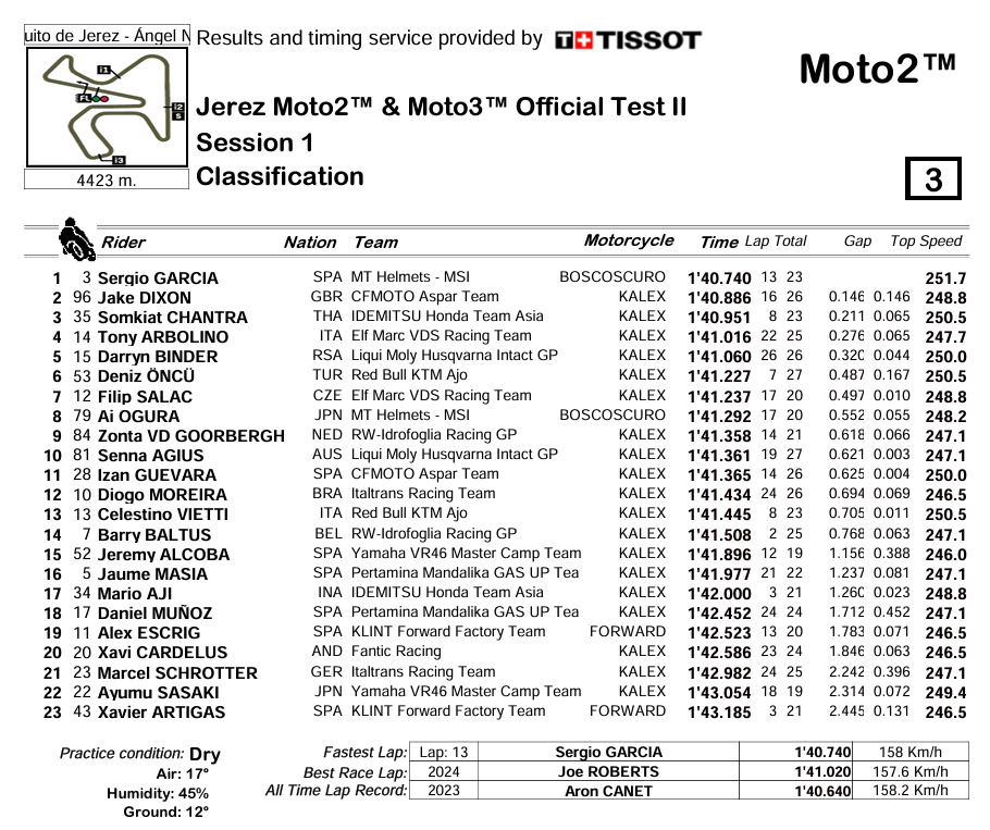Après les tests officiels du MotoGP, une seule journée de tests également pour les plus petites classes. En alternance avec le Moto3 (voici les résultats), plusieurs pilotes Moto2 étaient également en action, avec Jake Dixon qui s’est finalement imposé comme le meilleur de la journée devant Somkiat Chantra et Tony Arbolino. Les « invités » ne manquaient pas, comme Marcel Schrotter par exemple, avec Italtrans remplaçant Dennis Foggia, arrêté par des problèmes physiques causés par les chutes du GP d’Espagne. Le pilote européen Moto2 Daniel Munoz est en action pour Bo Bendsneyder, qui s’est également fracturé la clavicule gauche lors du week-end de course à Jerez.