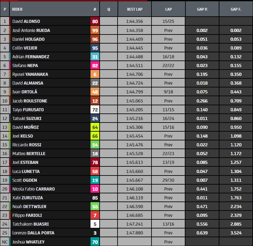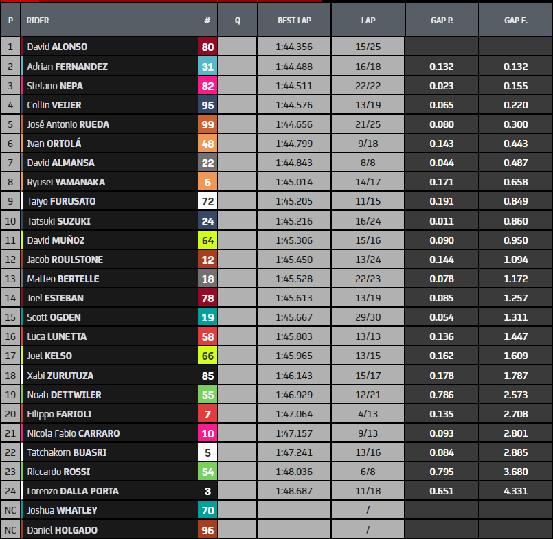Il reprend exactement là où il s’était arrêté lors des essais privés réalisés récemment par Moto3 à Portimao. David Alonso démarre les essais officiels à Jerez de la meilleure façon possible, c’est-à-dire en signant le meilleur temps de la première journée programmée. Stefano Nepa termine ce mercredi comme seul pilote italien présent dans le top 10. Certains accidents du jour sont au bilan, dont ceux de nos Matteo Bertelle, Luca Lunetta et Nicola Carrasco, ou encore David Almansa. Premier jour sur dossier, suite demain et vendredi. Ce sont des tests très importants pour comprendre les valeurs en piste, mais il y a déjà un nom en particulier qui, sans surprise, reprend là où il s’était arrêté à la fin de la saison 2023…