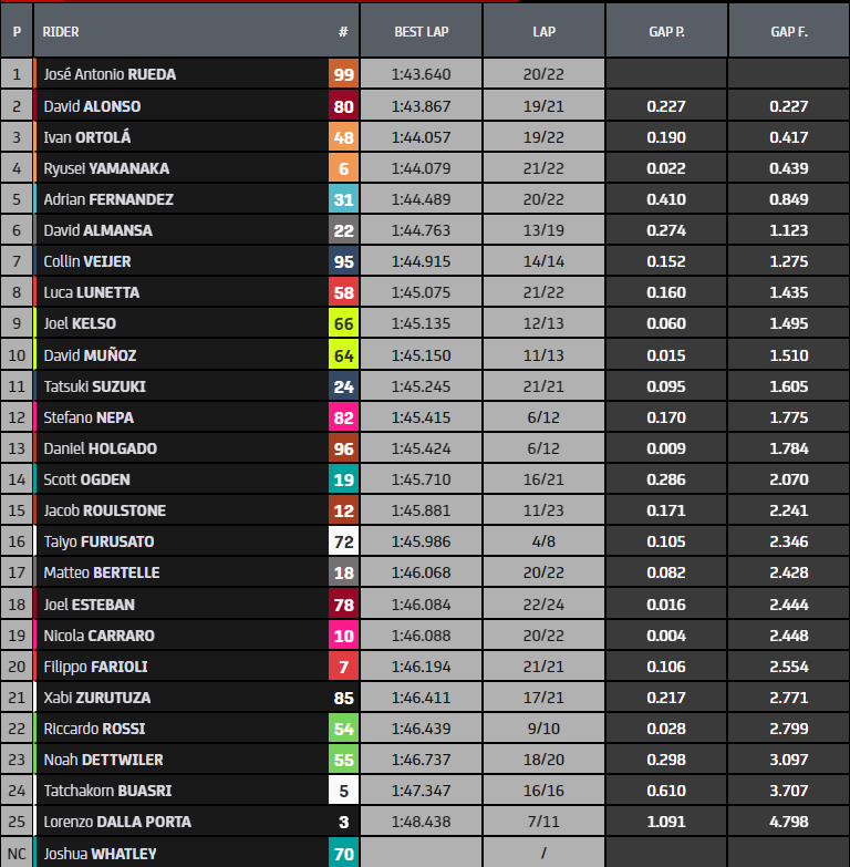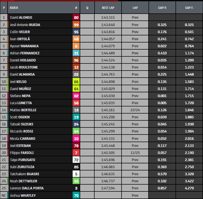 La « marche triomphale » de David Alonso lors de ces essais hivernaux se déroule sans problème. Le Colombien d’Aspar Team établit aujourd’hui aussi le temps de référence en Moto3, mais pas n’importe quand. Le précédent record officiel avait déjà été battu hier, aujourd’hui Alonso est tombé sous la barre des 1:44. Il n’était pas le seul : José Antonio Rueda, le meilleur de la première manche et 2ème du classement général de la journée, y a pensé le premier aujourd’hui, mais Collin Veijer y est également parvenu plus tard.
