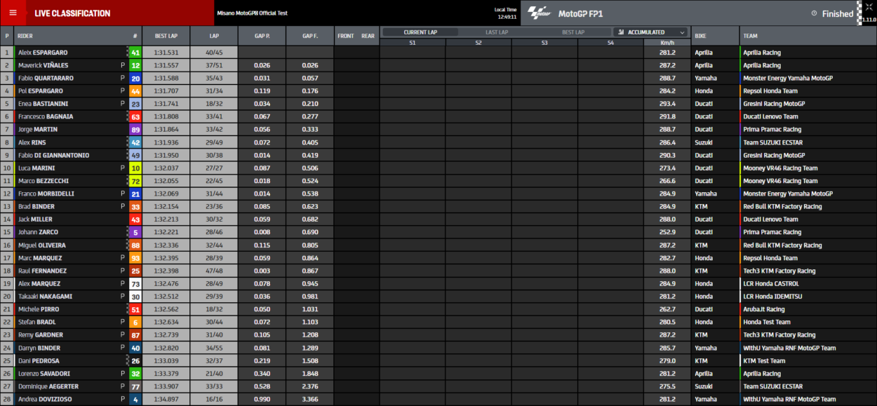 Najbardziej wyczekiwane testy MotoGP nie dały wiele do pokazania. Marc Marquez pojawił się ponownie na Hondzie RC-V już dziś rano w Misano. Szeroki uśmiech na jego twarzy po powrocie do garażu mówi bardzo wyraźnie… Wyjątkowy gość też działa, Dominique Aegerter, przyznany za tytuł MotoE kilkoma okrążeniami na Suzuki GSX-RR. Poranek pierwszego dnia testów kończy się właśnie na prowadzeniu przez parę Aprilii Aleix Espargaro w ostatnich minutach skoczył przed Maverick Vinales, przed Fabio Quartararo. Trio zamknięte w zaledwie 57 tysięcznych!