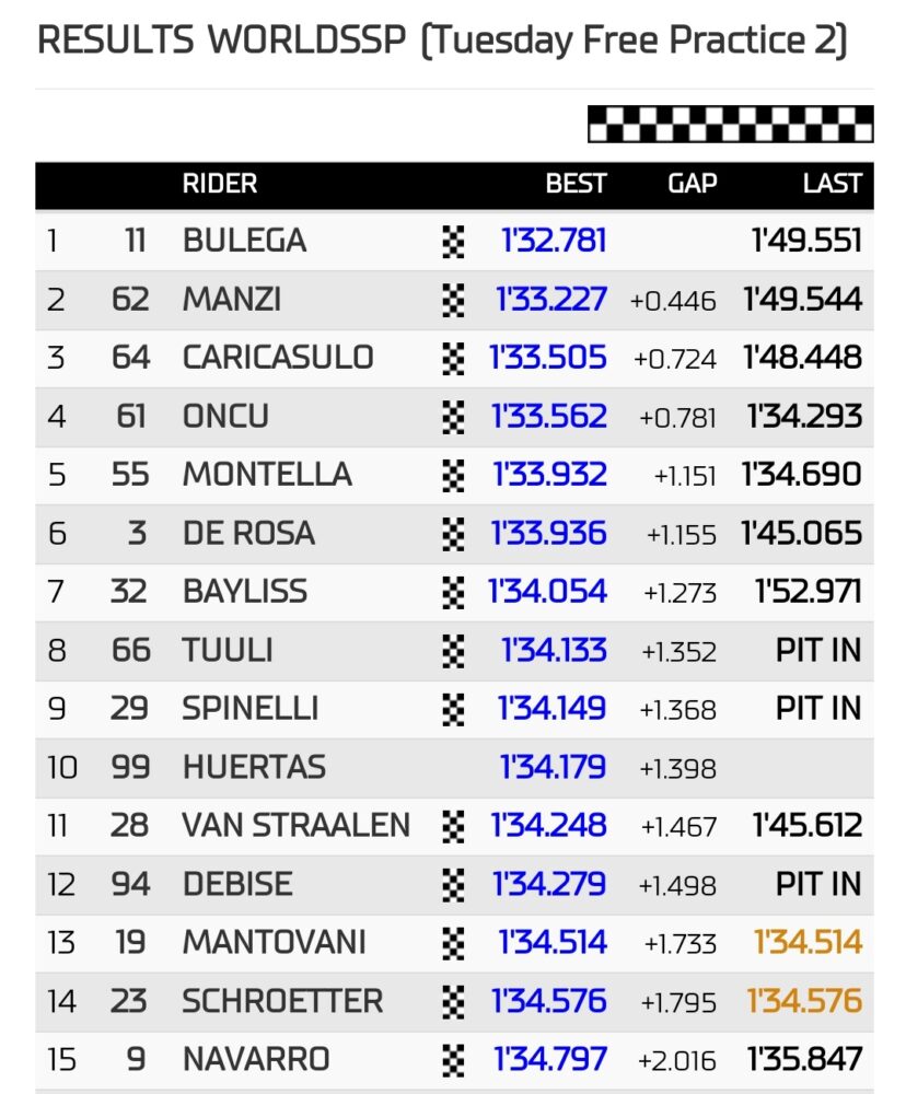 Nicolò Bulega a laissé Stefano Manzi de 166 millièmes lors de la première séance, un avantage qui est passé à plus de quatre dixièmes lorsqu’il a arrêté le chrono sur 1:32.781. Confirmation de l’excellente forme du porte-drapeau Aruba Ducati, voire des Reds en général, seules la Yamaha de Manzi et la Kawasaki de Can Öncü brisant sa domination aux sept premières places. En effet, ce sont les noms du top 3 combiné du jour, mais comme mentionné, il semble que Bulega soit passé à la vitesse supérieure ces jours-ci. Ducati était la seule marque sans victoire en 2022, mais si ce sont les prémisses, c’est tout de même un rapide de courte durée…